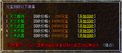 6、沃玛、祖玛、赤月单独回收有经验和金币,切勿当垃圾回收!垃圾回收只有金币,没有经验,还比较少!