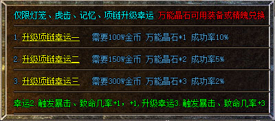 2、顶部按钮【综合服务】可以把灯笼、虎齿、记忆,升级到幸运+3,升级到幸运+3附带3%暴击几率、致命几率等