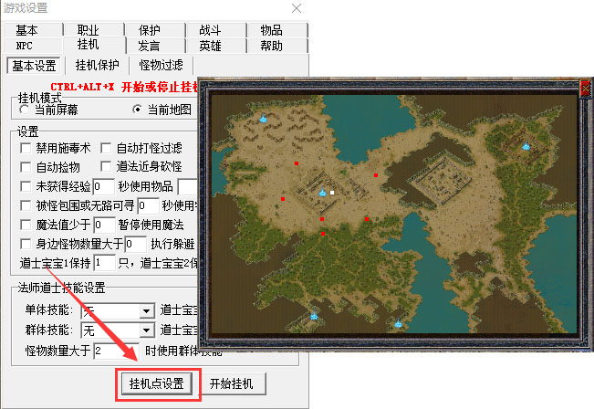 【挂机设置】:需要点开【挂机设置】按钮, 然后用鼠标左键点击小地图,加上小红旗!小红旗就是挂机的巡航地点!