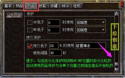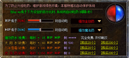 【内挂喝药】: 点击游戏右下角界面(退出游戏按键上方)内挂喝药,设置好HPMP百分比即可,勾选上您所选药品!(攻城后开放万年雪霜,合区后开放疗伤药)