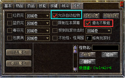 【挂机拾取】: 挂机时要自动拾取物品,需要勾选允许自动捡物
