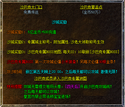 攻城设置详细见盟重NPC【攻沙使者】!