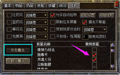 【攻击魔法】: 单体攻击技能设置,法道需要选择挂机技能,否则将会是近身砍怪,而不放技能