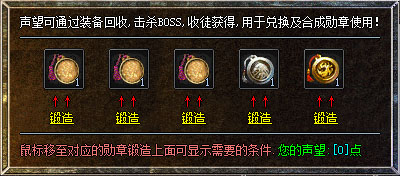 2、顶部按钮【装备回收】处回收声望、土城左方NPC【勋章系统】兑换勋章!